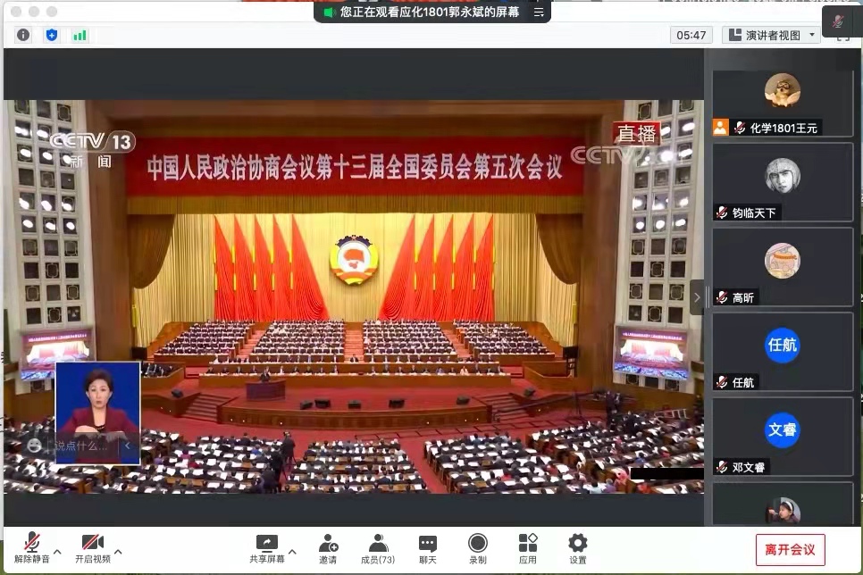 开幕会后,三个本科党支部的成员们就全国政协十三届五次会议开幕会分享学习心得。其中本科化工党支部黄亚楠同志表示今日汪洋主席一句话令他影响深刻——“要努力做担当者而非旁观者、践行者而非清淡者”。他认为关注人民生活最重要的就是付诸行动改善人民生活;本科化学党支部陈思卓同志讲到:“两会串联大之国家的宏愿与小之个人的希冀。防疫、双减、冬奥、妇女儿童拐卖等等全民重视的问题也同样牵动着委员的思绪。全国两会汇集民智、反映民意、影响民生,回应老百姓们的关注。”最后,本科应化党支部杨张帝同志表达了对祖国的美好祝愿:“是祖国的强大一直保护着我们,让我们幸福安全,希望祖国越来越繁荣昌盛!”
