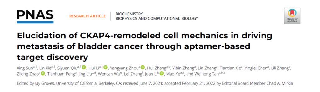 4月11日,化学生物传感与计量学国家重点实验室、太阳集团城网站2017分子科学与生物医学实验室(MBL)的叶茂/谭蔚泓教授团队在《美国科学院院刊》(PNAS)杂志发表题为“Elucidation of CKAP4-remodeled cell mechanics in driving metastasis of bladder cancer through aptamer-based target discovery”的文章,开拓了膀胱癌力学研究的新方向,为膀胱癌的防治提供了新思路。