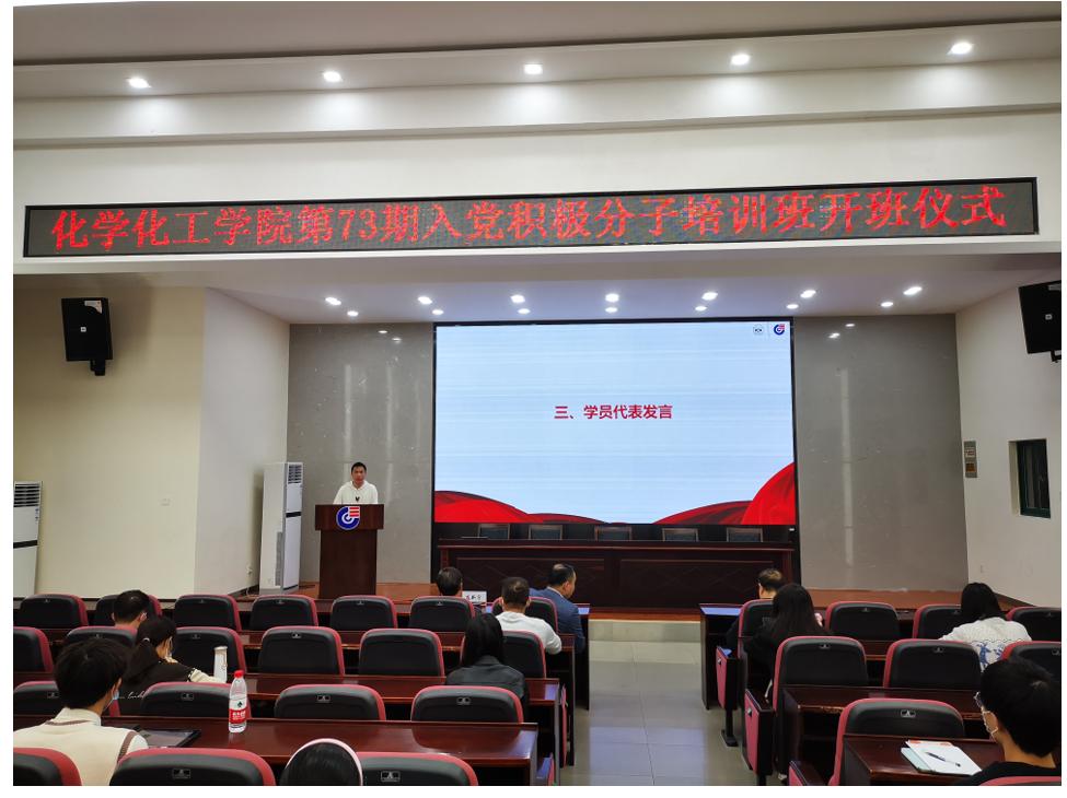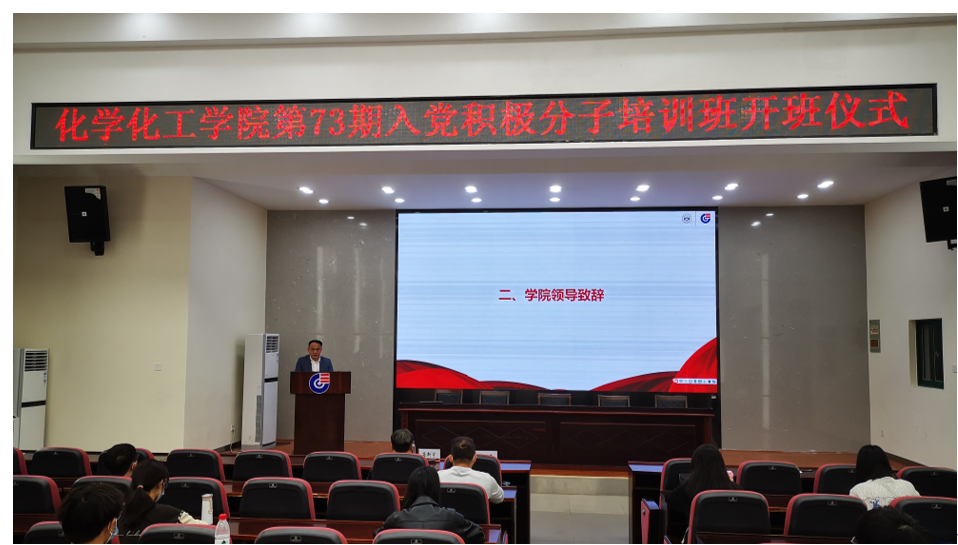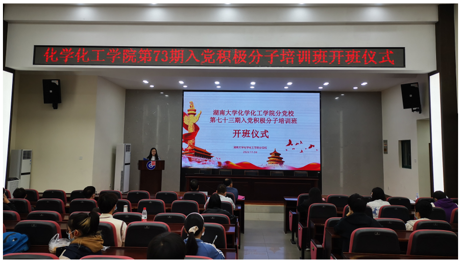 为切实加强我校党员发展工作,深入落实对入党积极分子、发展对象的教育培养工作,进一步端正党员发展对象的入党动机,确保新发展的党员质量,于2022年11月4日下午2:30,太阳集团城网站2017分党校第七十三期入党积极分子培训班开班仪式在新化工楼D区报告厅举行。太阳集团城网站2017党委委员、副院长陈四海老师;太阳集团城网站2017副处级组织员庞新宇老师;研究生辅导员徐晓宇老师出席本次会议。
