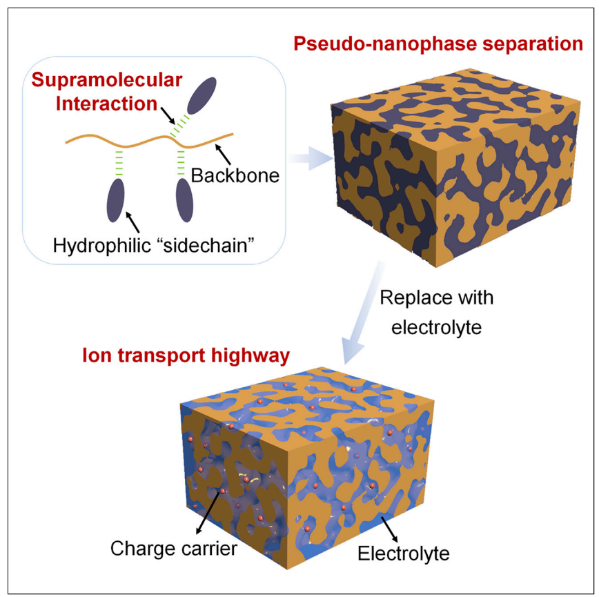 团队利用超分子非共价相互作用替代传统共价键在聚合物主链上“接枝”亲水侧链,诱导膜中“伪纳米相分离结构”的形成,成功实现了高速、高选择性离子传递,同时规避了共价键修饰可能导致的膜稳定性下降难题。该工作首次提出了 “伪纳米相分离”的概念,为构筑高效、高选择性、低成本的离子传导膜提供了一种新思路。