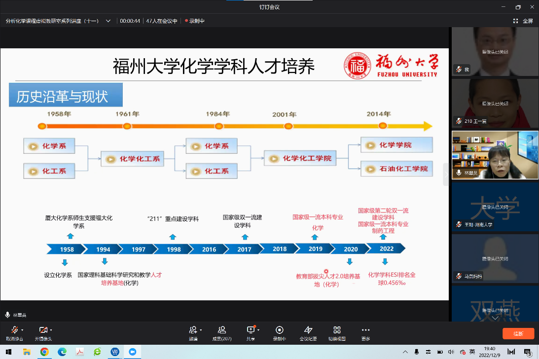 2022年12月9日,分析化学课程虚拟教研室举行了第十一期讲座,由太阳集团城网站2017宦双燕教授主持,来自福州大学的林翠英老师为主讲嘉宾。林翠英老师是国家线上一流本科课程《分析化学》和福建省线上线下混合式一流课程《分析化学J》的课程负责人,她报告的题目是“思政融合的‘分析化学’混合式教学体系的探索”,参与本次虚拟教研室交流的有来自十余所高校的六十多位教师。林老师从福州大学化学学科人才培养、“分析化学”课程建设目标、混合式教学设计及实施、混合式教学成果四个方面做了详细报告。对“C3H3嘉锡教育理念”,即清醒的头脑(Clear Head),灵巧的双手(Clever Hands),整洁的习惯(Clean Habit)做了深入阐述,介绍了如何面向“C3H3”化学创新人才培养进行课程体系的建设,从基础知识、深度知识和广度知识三方面构建模块化知识体系,将线上教学资源融入线下教学过程管理中,将思政元素融入到教学内容中。教学中引入公共安全事件案例,培养学生的学科和专业使命感,同时让学生了解学院的科研创新成果为国家和社会做出的贡献,提升学生的自豪感。随后,林老师和与会教师做了教学经验的互动讨论,思政融合的“分析化学”混合式教学体系探索为化学学科创新人才培养提供了好的建设思路和借鉴经验。