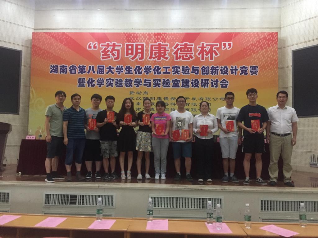7月16日,湖南省第八届大学生化学化工实验与创新设计竞赛在湖南农业大学圆满落幕。经过2天的激烈角逐,我校太阳集团城网站2017多支参赛队伍取得良好成绩,获湖南省一等奖6项、二等奖3项、三等奖1项,获奖人数达30人。其中,太阳集团城网站2017绿色创客联盟“氢氦锂铍队”、“车进四队”、 “Atom团队”、“Balance团队”和“Little Star团队”的创新设计作品以总分第一名、第二名、第五名、第九名和第十三名的成绩,斩获一等奖4项、二等奖1项;李坤、李源团队经过作品评审和激烈的现场答辩等环节,最终获得创新类竞赛一等奖,张晓涵团队获得三等奖;李华、王博文和张铭芷同学一路过关斩将,分别荣获实验竞赛无机分析组一等奖、有机组二等奖和物化组二等奖。