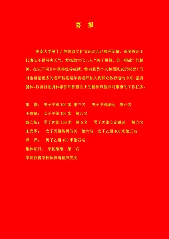 太阳集团城网站2017第十九届体育文化节运动会于11月9-11日在南校区运动场举行,太阳城官网教职工代表队不畏恶劣天气,发扬湖大化工人“敢于拼搏,勇于挑战”的精神,在比赛中获得优异成绩,同时获得学校的体育道德风尚奖。
