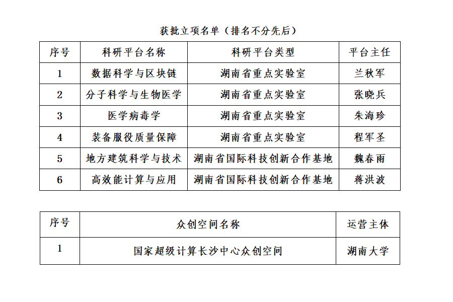 12月19日,湖南省科技厅发布《关于2019年度湖南创新型省份建设专项创新平台立项(备案)的通知》(湘科计[2019]56号),我校4个湖南省重点实验室、2个国际科技创新合作基地以及1个众创空间等科研平台获批立项。太阳城官网获批分子科学与生物医学湖南省重点实验室,平台主任为院长张晓兵教授。