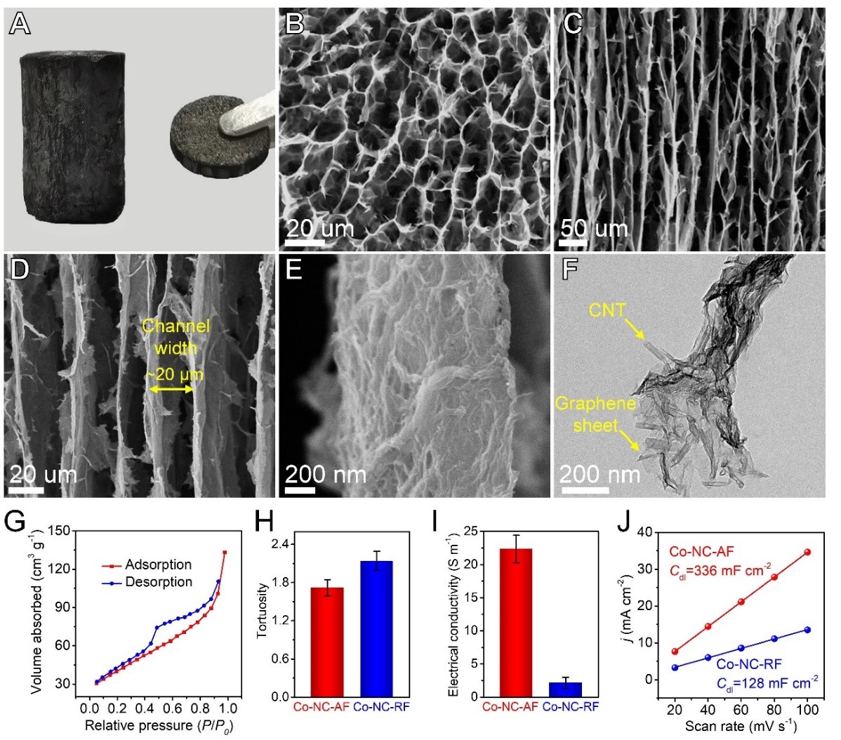 太阳集团城网站2017费慧龙课题组报道了一种嵌有单原子位点的定向多孔碳膜电极用于高电流密度产氢。在该膜电极中,单原子位点表现出较高的本征活性;整体式膜电极负载量高,提供丰富的活性位点;垂直排列微通道的碳骨架具有多尺度的孔结构,在高产率和超厚电极条件下仍保持高效的传质效率;此外,膜的超润湿性能促进电解液的润湿,同时保证产生的氢气气泡及时脱除。